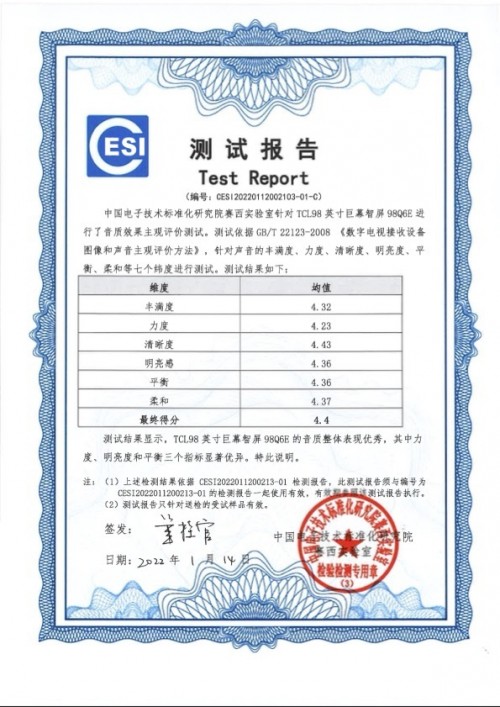 日前,中國電子技術標準化研究院還對搭載了安橋音響的TCL 98英寸巨幕電視展開了音質效果的主客觀評測。在主觀評價環節,中國電子技術標準化研究院邀請了18位音質領域的金耳朵專家,在耗巨資打造的國內頂級視聽室進行了豐滿度、力度、清晰度、明亮度、平衡、柔和六個緯度的測試,最終,TCL 98英寸巨幕電視獲得了4.4分(4分以上即為優秀水平)的優異成績。