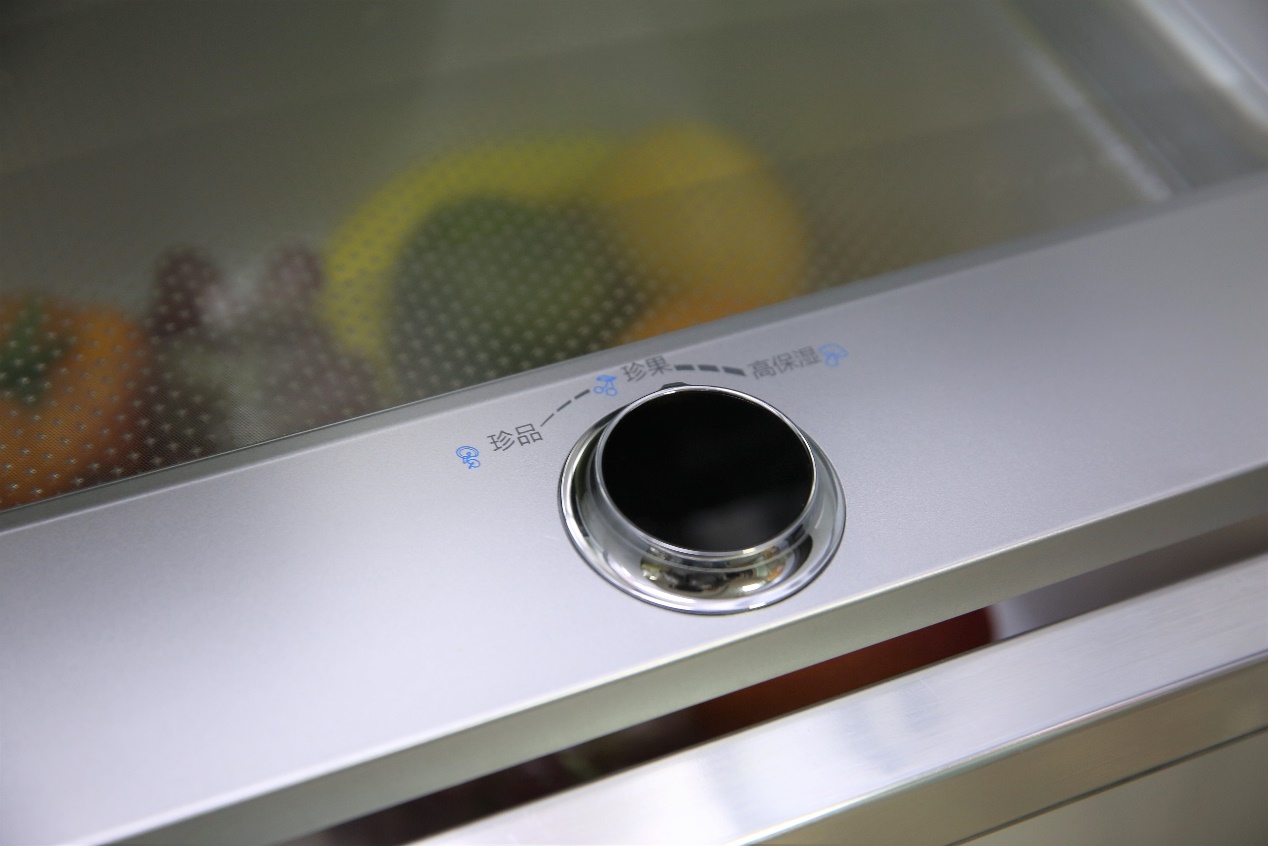 冷藏室內的兩個保鮮盒分別具有干濕可調節和變溫的功能。干濕空間上方有一個調節旋鈕,可以進行三檔調節。蔬菜水果需要濕度較高的儲存環境,干果則需要濕度較低的儲存環境,我們可以根據所儲存食材來選擇合適的濕度,這樣更有利于長時間保存。變溫空間可以選擇臻鮮、0度保鮮、母嬰幾種模式,方便保存特定的食材或物品。