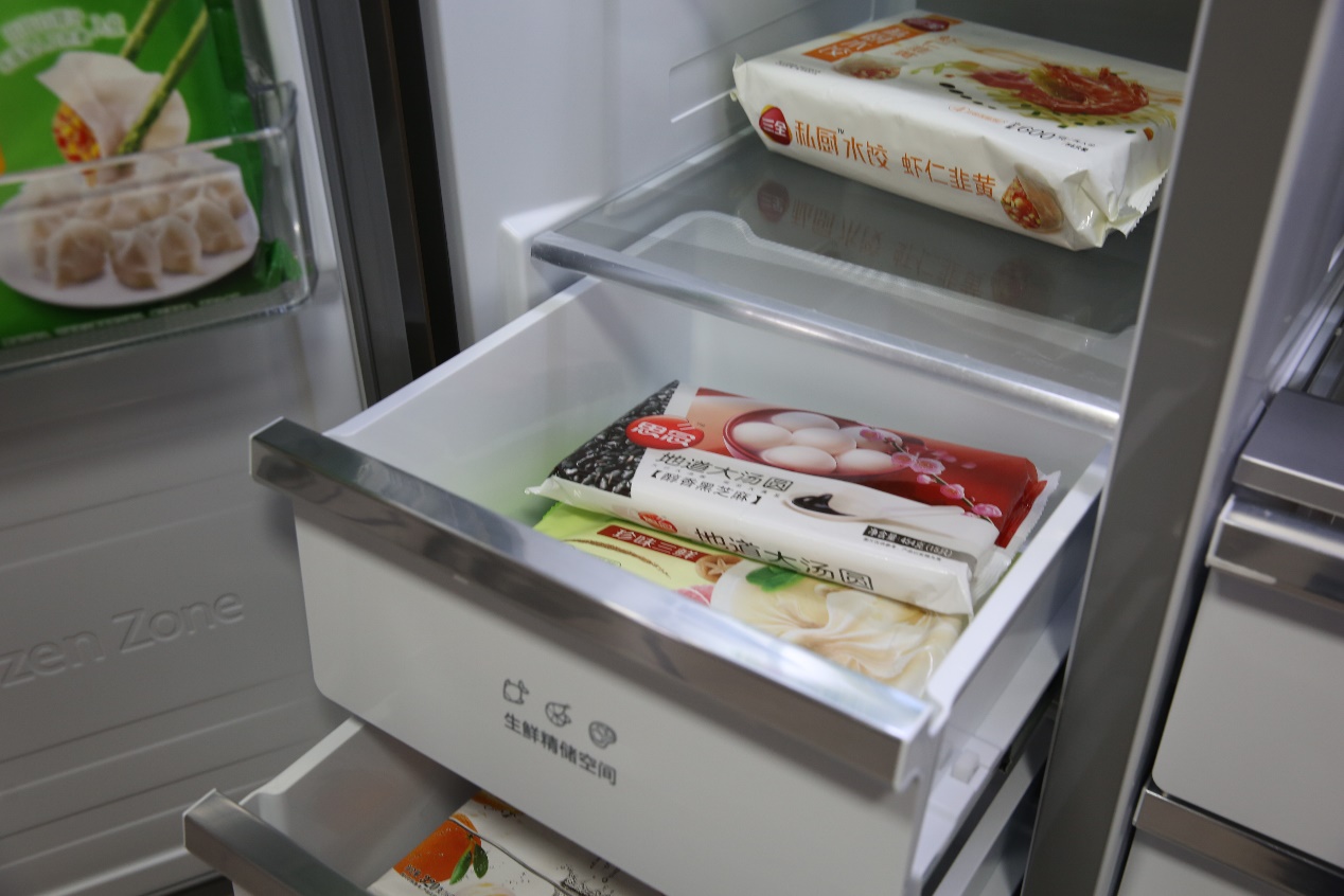 冷凍室最下邊設計了一個獨立冷凍空間,這里使用了硅膠密封條而且有獨立風口,專門存放熟食、冰激凌、母乳等。因為冷凍室內有大量生肉類食材,分開存放更衛生,有了這個獨立冷凍空間也能防止串味。