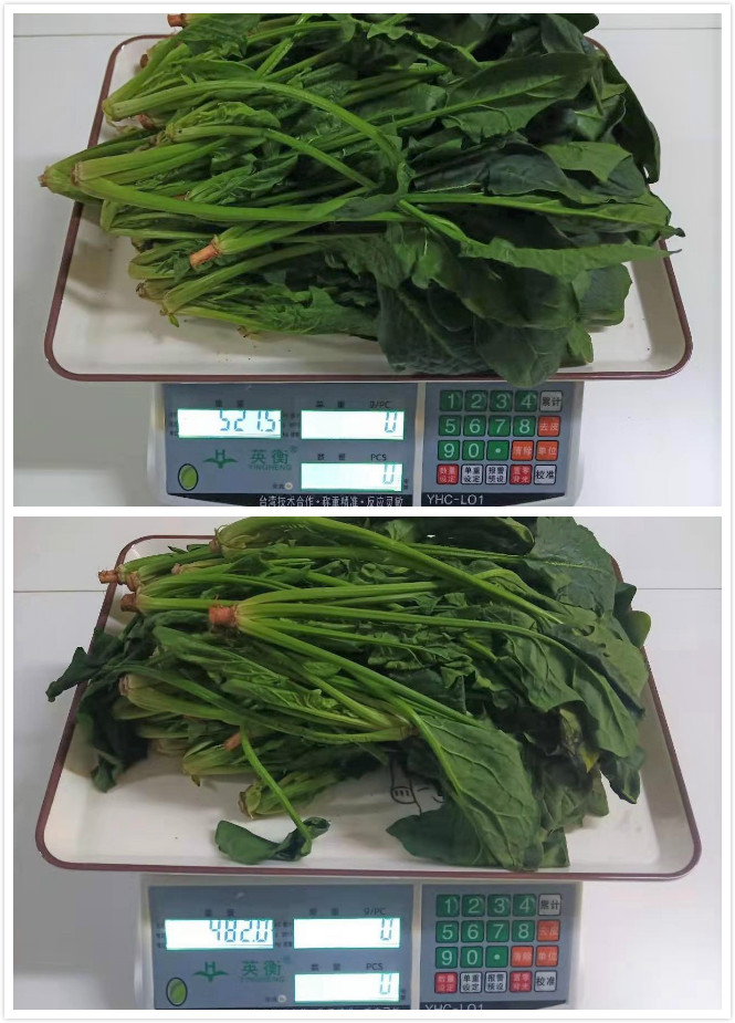 冰箱的保鮮能力表現的更為直觀,對人們來說也更重要。我們稱量了521.5克的菠菜,放進冷藏室干濕空間內,調到高濕模式,冰箱設置為智能模式。5天后取出菠菜,再次稱量,剩余菠菜482克,質量損失7.6%。菠菜作為失水率較高的一類蔬菜,5天時間失水率僅僅7.6%,這個結果是很多高端冰箱做不到的,高濕模式對蔬菜保鮮確實很有幫助。