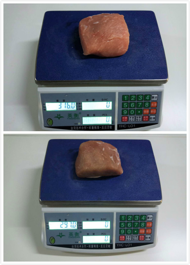 冷凍室還是選擇使用豬通脊肉,冷凍前豬肉質量316克,放入冷凍室冷凍7天,冰箱同樣設置為智能模式。取出化凍后擦干血水再次稱量,豬肉剩余297克,質量損失6%。在同檔次冰箱中,質量損失處于較低水平。