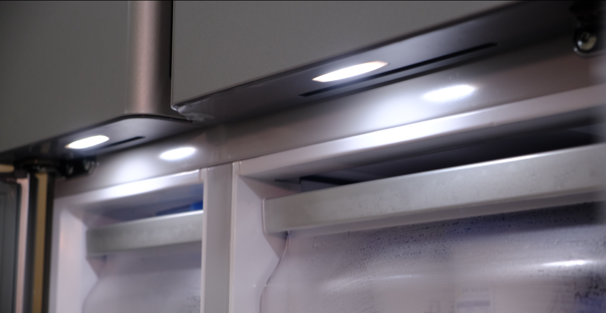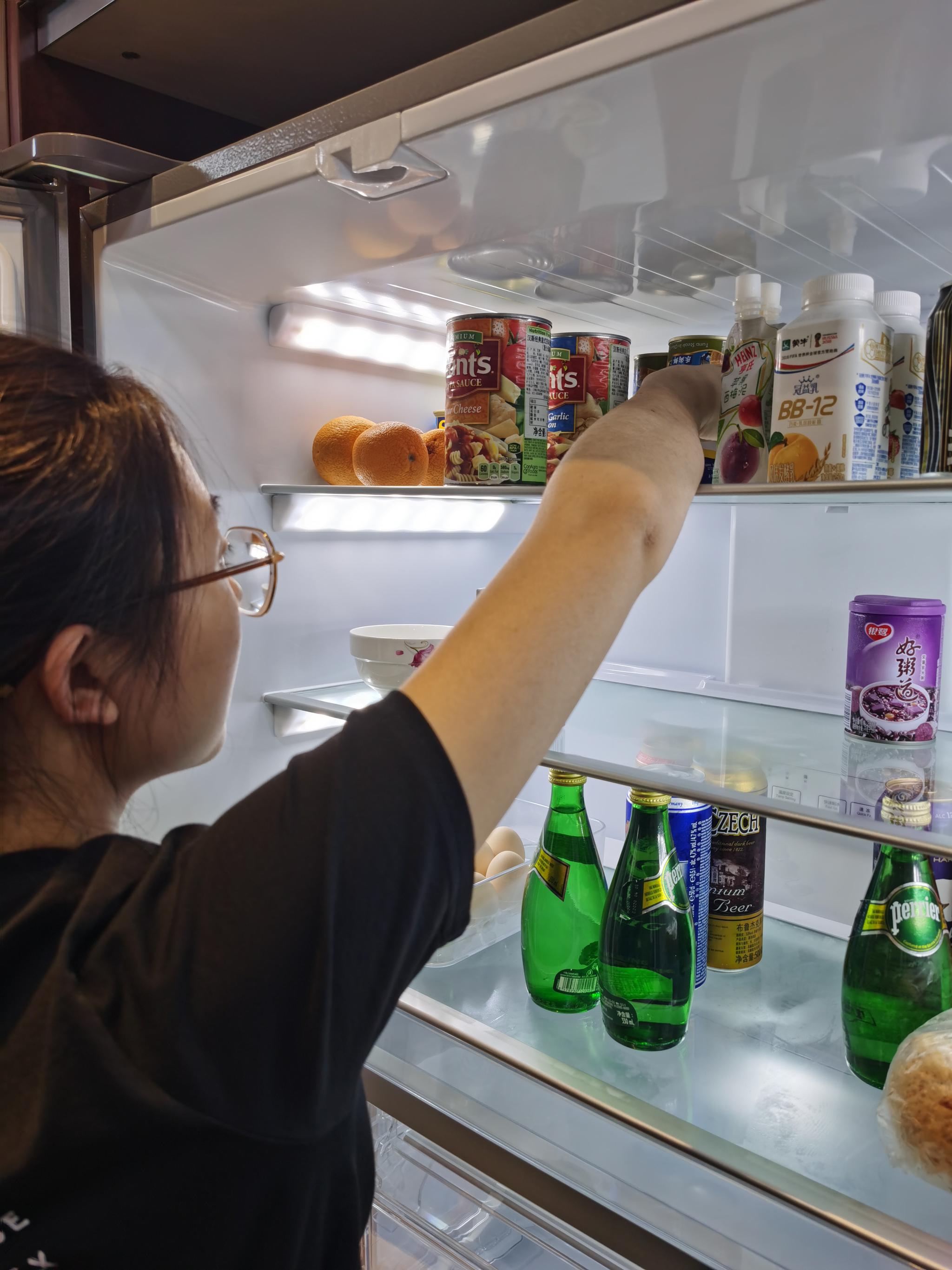 這款冰箱采用了全局照明,不光是冷凍有燈,冷藏更是有7處燈光,像舞臺一樣,照明無死角,可以一目了然地進行食物的取放。