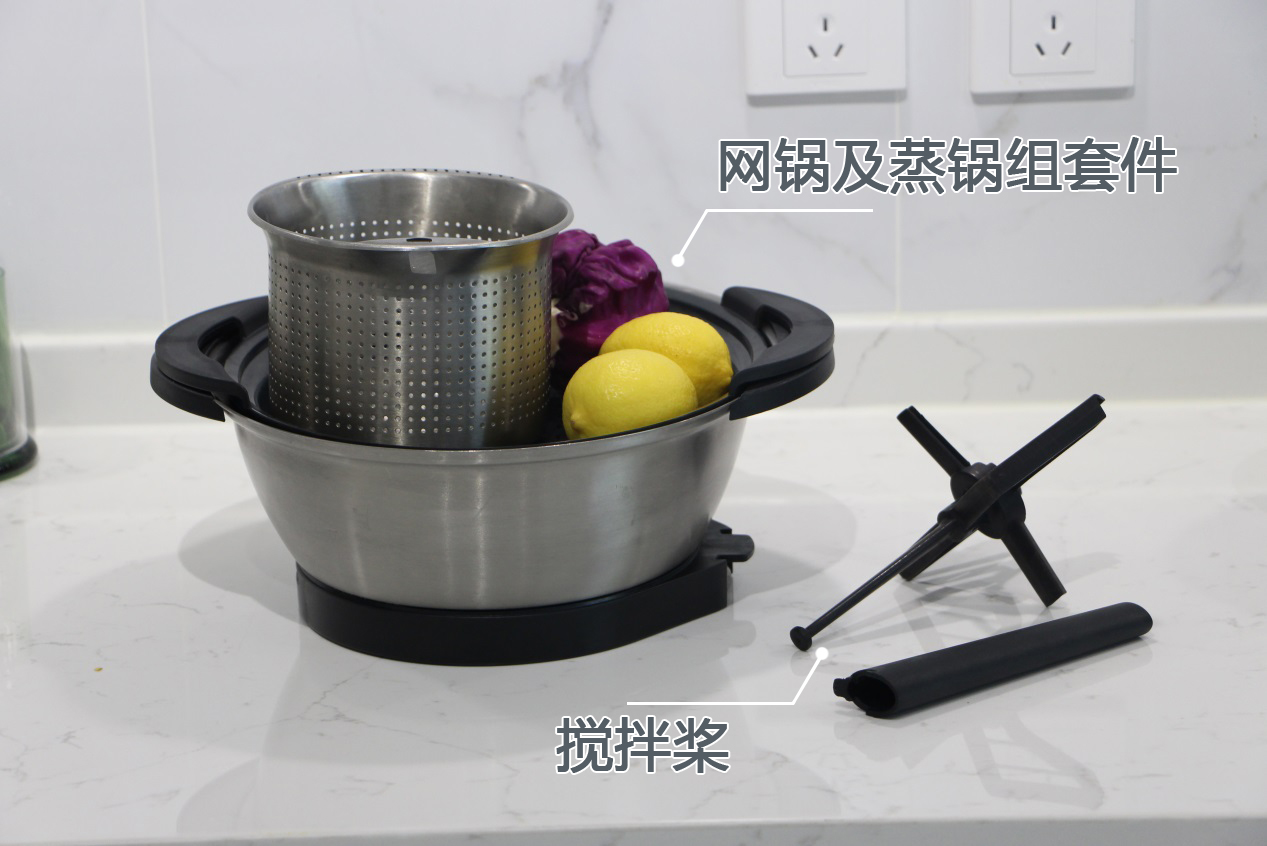 產品主要分為三個結構,機身部分、多功能炒鍋、蒸鍋,全機身一體化金屬工藝,不留縫隙死角。機身位置最亮眼的在于7英寸大屏,同時這也是該款產品實現智能化、人性化功能的主要窗口,在烹飪時將會給予你事無巨細的幫助。