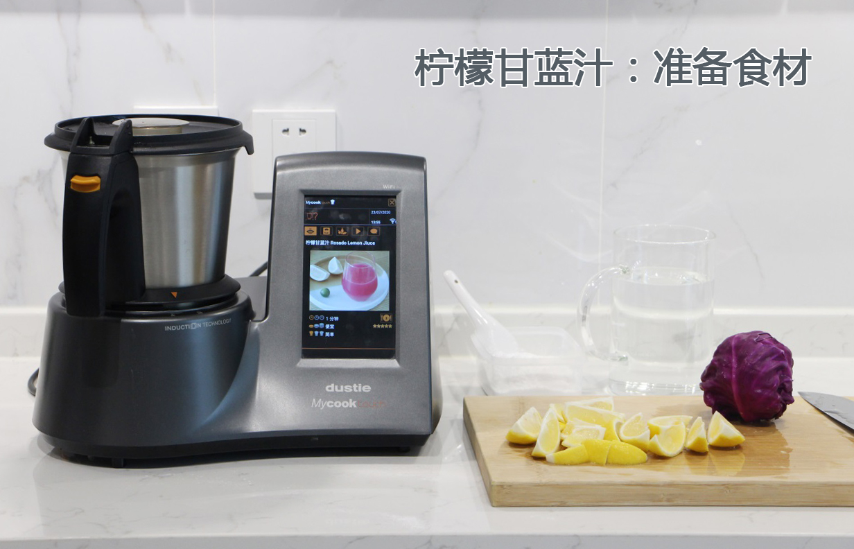 在產品面板中有明確的配方配比供我們參考,稱重功能的重要性在此凸顯,保證最終成品的風味正宗。50g紫甘藍、600g水搭配60g糖粉依照稱重顯示的克數依次投入,也可以根據個人喜好略微增減。最終不到1分鐘的時間一份檸檬甘藍汁的成品就做好了。