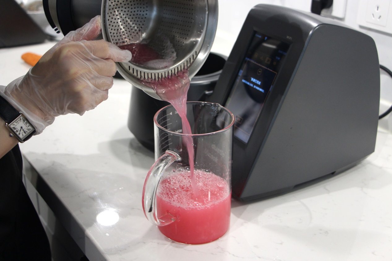 通過產品搭配的過濾籃倒入容器中,檸檬的酸與紫甘藍的紫色物質融合而變成了明媚的粉色,果汁不僅顏色討喜,果汁水體也非常清澈,沒有明顯的籽粒殘渣、果肉纖維等,入口酸甜適宜,非常適合款待客人和佐餐飲用。