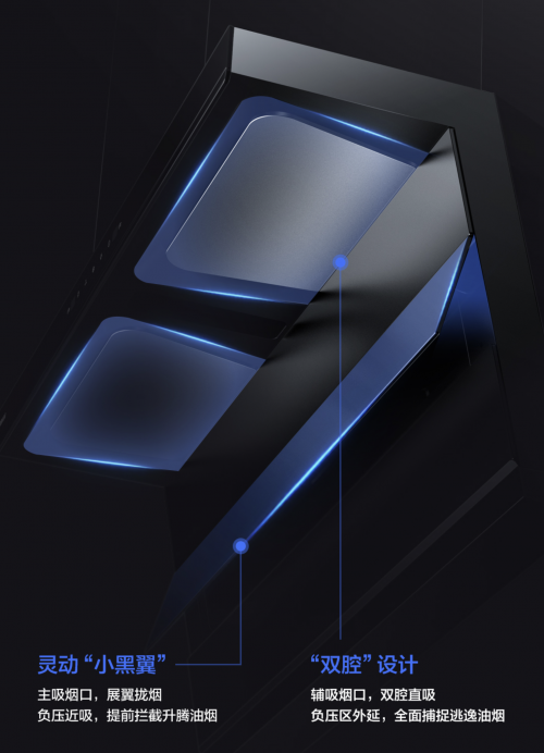 中式烹飪注重猛火爆炒,因此在烹飪過程中,不可避免地會產生大量的油煙。為了滿足消費者對凈煙的強烈需求,小黑翼D1在設計中展現出了天然的優勢。當煙機工作時,側邊的小黑翼會自動啟動,形成一道有效的屏障提前攔截升騰的油煙,同時避免了油煙對烹飪者臉部的直接接觸。此外,煙機頂部的雙腔設計使得負壓區外延,全面捕捉逃逸油煙。簡而言之,D1通過靈動小黑翼和雙腔設計的完美結合,使兩個吸煙口各司其職。側面吸煙口更靠近煙源,能夠攔截并吸盡大部分油煙,而頂部吸煙口則能大范圍強效攏煙,為廚房提供更加清潔、健康的環境。