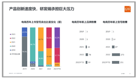 會上,由GfK中怡康發布的《2023洗地機市場總結及趨勢預測》指出,2023年截至9月,洗地機的累計市場規模達到96.8億元、411萬臺。因其產品的多場景化及出色的深度清潔能力,洗地機已經成為中國清潔電器市場的第一品類。而洗地機的快速增長也催生了激烈的競爭環境, 2023年截至9月,電商的新上型號數量已達到251個。
