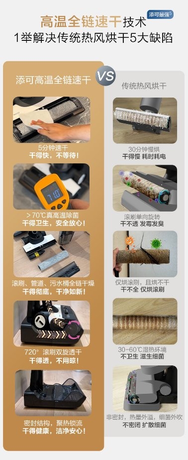 對于消費者所關注的自清潔問題,添可芙萬Booster Pro所搭載的5分鐘全鏈速干+70℃密封除菌技術,一舉解決了熱風烘干的5大缺陷,為用戶帶來全新清潔體驗,引領行業邁入“高溫速干新紀元”。