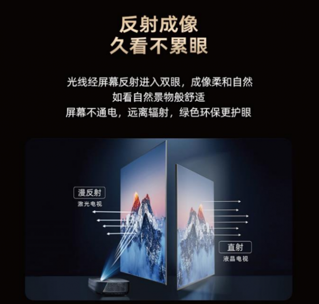 不同于傳統(tǒng)液晶電視的直射成像,海信激光電視采用漫反射原理,光線經(jīng)屏幕進入雙眼,成像柔和自然。海信激光電視L5K、L8K均從光源處剔除了對人眼損傷最大的有害短波藍光。同時屏幕不通電,不會產(chǎn)生輻射。同時,低反射率的菲涅爾無源抗光屏可帶來低眩光、低反射的觀看體驗,久看不累眼。