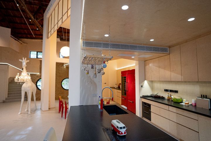 眾所周知,姜妍女士是個非常會做飯的女明星,這次的改造項目是她的美食工作室,所以對于餐廚空間的空氣要求非常高,因此我在核心烹飪區選擇了——日立廚房專用空調,特別是它的銀離子除菌和抗油煙系統,能時刻保持廚房環境的干凈清爽。