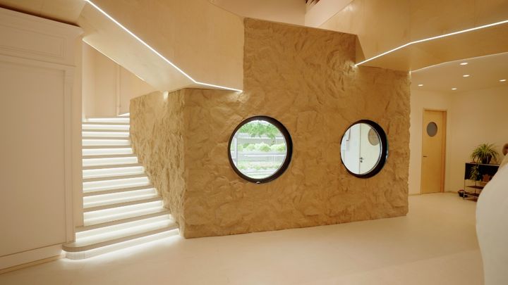 燈光隧道的長度和光線的遞進感,營造出一種靜謐的空間氛圍。連接的兩個獨立空間:休息室和會議室,既滿足功能性的空間分隔,又能保證內部空間的安靜和私密。