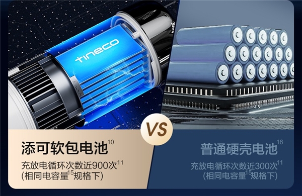 洗地機(jī)電池普遍采用的是普通圓柱電池,而添可領(lǐng)銜行業(yè)電能升級,首次在洗地機(jī)上使用數(shù)碼產(chǎn)品的軟包電池。在相同規(guī)格電容量下,軟包電池的電芯充放電循環(huán)次數(shù)高達(dá)900次,遠(yuǎn)超普通圓柱電池的300次,其電芯循環(huán)壽命達(dá)到了后者的3倍,而重量反而減重15%,操控更靈巧,避免機(jī)身笨重降低用戶體驗。