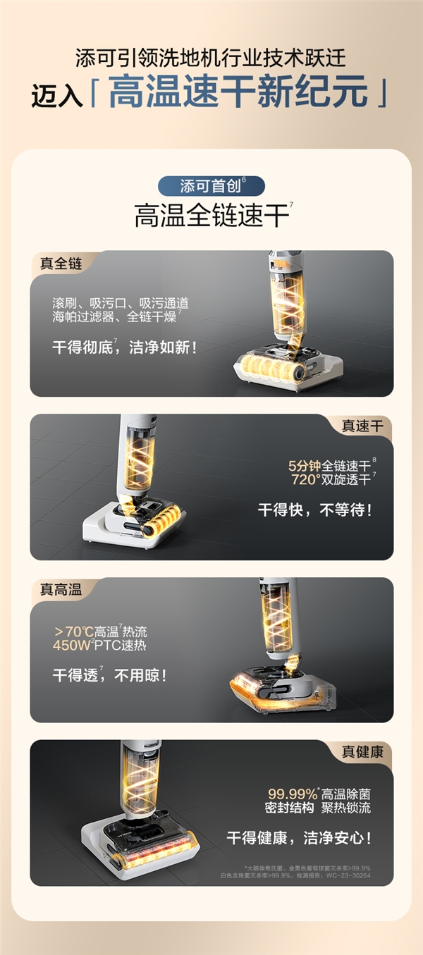 添可作為5min高溫全鏈速干賽道的開創(chuàng)者,也是傳統(tǒng)熱風(fēng)烘干技術(shù)的終結(jié)者。利用底座密封包裹式設(shè)計以及滾刷720°雙旋,僅需5分鐘,高溫?zé)崃骶湍茏対L刷、海帕過濾器、吸污口及其附近通道等部位速干*,托盤上臨近滾刷的出風(fēng)口處最高溫度仍超過70℃,99.99%高溫除菌*。無論是追求效率的上班族,希望更省力、更安全的寶媽,還是追求領(lǐng)先科技的生活家們,都會被芙萬Stretch的這一技術(shù)所打動。