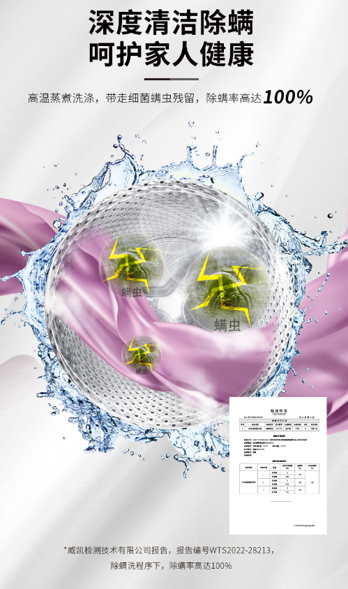 洗得干凈是一臺洗衣機的“面子”功夫,讓衣物洗得更健康,穿得更安心,則是洗衣機的內功。Beko倍科至愛系列12KG洗衣機,至高96℃高溫蒸煮洗滌,帶走細菌螨蟲殘留,除螨率高達100%*(威凱檢測技術有限公司報告,報告編號WTS2022-28213,除螨洗程序下,除螨率高達100%)。搭配高溫消毒洗,實現多方位健康呵護。更有筒自潔,高溫高轉速熱水洗滌內筒夾層,充分瓦解殘留污垢,讓衣物遠離二次污染。