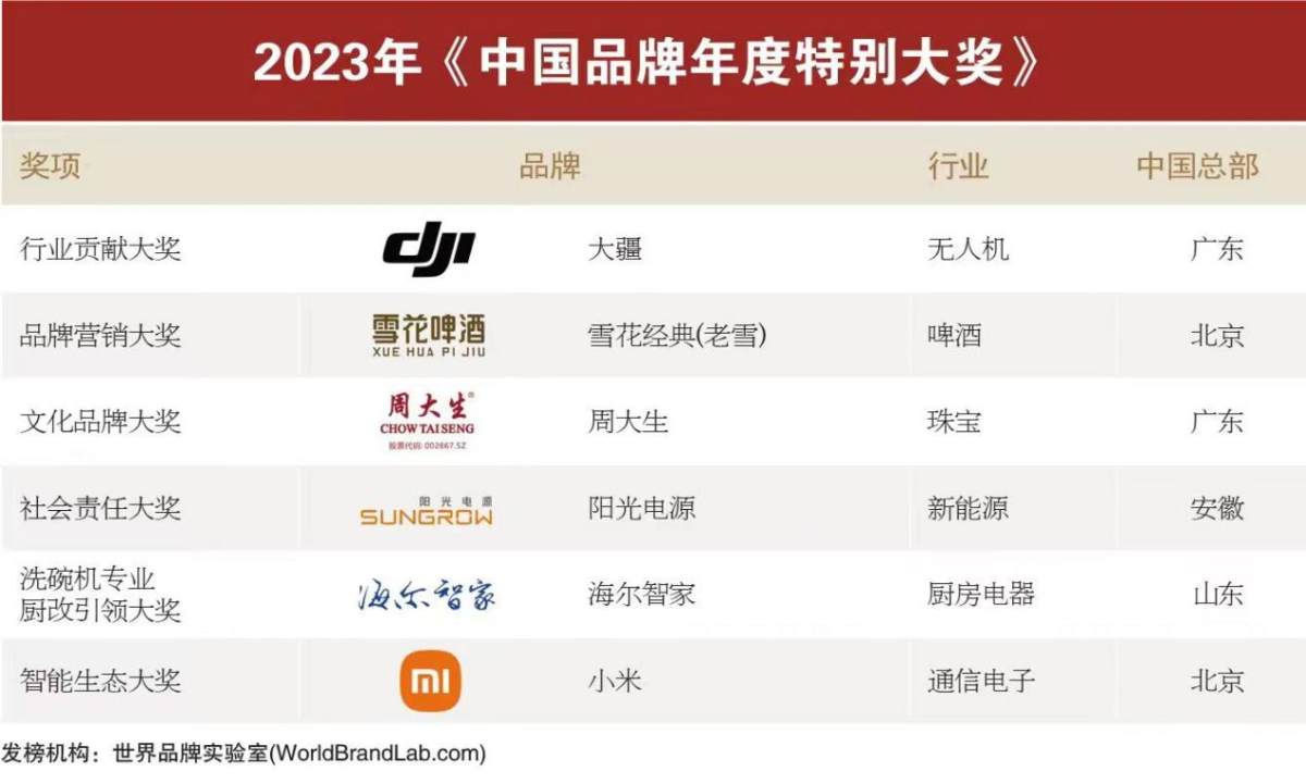 據(jù)了解,本屆品牌年度特別大獎依據(jù)行業(yè)及企業(yè)特點,設(shè)立了“行業(yè)貢獻(xiàn)大獎、品牌營銷大獎、文化品牌大獎、社會責(zé)任大獎、廚改引領(lǐng)大獎和智能生態(tài)大獎”等6個特別獎項。大疆獲得“2023年行業(yè)貢獻(xiàn)大獎”;雪花經(jīng)典獲得“2023年品牌營銷大獎”;周大生獲得“2023年文化品牌大獎”;陽光電源獲得“2023年社會責(zé)任大獎”;海爾智家獲得“2023年洗碗機專業(yè)廚改引領(lǐng)大獎”;小米獲得“2023年智能生態(tài)大獎”。