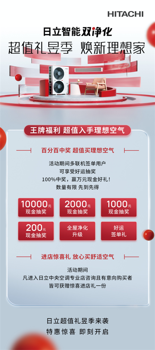 在315來臨之際,日立重磅推出“超值禮昱季煥新理想家”鉅惠活動(dòng)。優(yōu)質(zhì)產(chǎn)品、勁爆優(yōu)惠、貼心服務(wù)應(yīng)有盡有,真真切切給消費(fèi)者一個(gè)放心選購(gòu)的保障。2月24日—3月17日,正準(zhǔn)備家裝煥新的朋友們,遇到日立這場(chǎng)鉅惠福利,趕緊進(jìn)店參與活動(dòng)吧。王炸新品、十倍膨脹金、10000元現(xiàn)金補(bǔ)貼、免費(fèi)禮品直送...超多福利等你來薅!