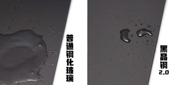 然而,黑晶鋼2.0的魔力不止于外觀。其實用性才是真正的殺手锏,老板在面板上加入了OPTOOL涂層,它具有出色的疏油疏水以及耐磨耐刮的特性,性能遠(yuǎn)高于普通鋼化玻璃。具體表現(xiàn)上,它能讓水滴趨向聚集,減少水漬擴(kuò)散面積,從而減輕清潔負(fù)擔(dān)。更為神奇的是,清洗后表面不留任何水痕,輕松一擦即恢復(fù)潔凈如新。即使面對頑固污漬,使用鋼絲球輕輕擦拭也能毫不費(fèi)力地徹底清除,而且完全不必?fù)?dān)心會劃傷面板。