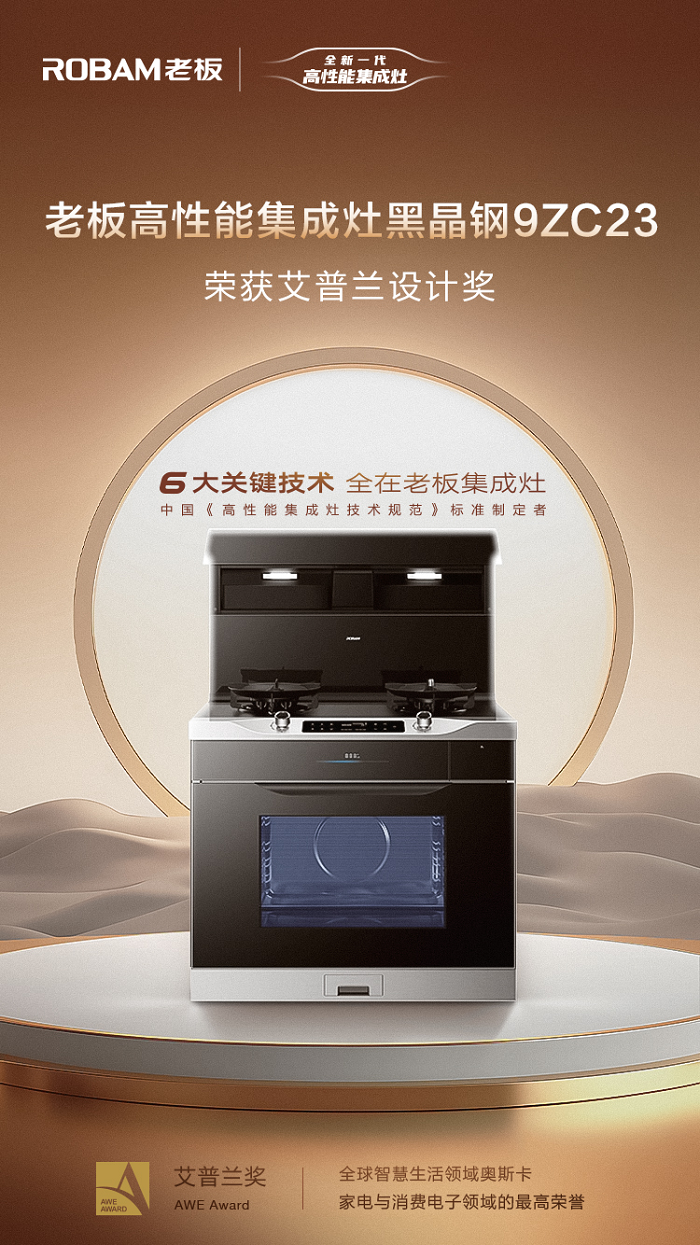 值得一提的是,展會期間這款產(chǎn)品還獲得了2024AWE艾普蘭設(shè)計大獎,該獎項被譽(yù)為是全球智慧生活領(lǐng)域奧斯卡,它代表著行業(yè)最高水準(zhǔn)與最新技術(shù)的走向。老板高性能集成灶黑晶鋼9ZC23的成功獲獎,不僅彰顯了其在設(shè)計創(chuàng)新、技術(shù)革新和用戶體驗方面的卓越實力,也進(jìn)一步鞏固了老板電器在集成灶行業(yè)的領(lǐng)先地位。