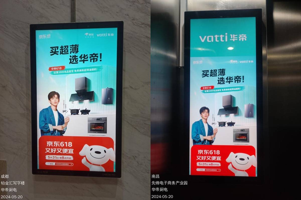 華帝品牌早在5月20日就聯合京東,啟動了全國范圍內的線下廣告攻勢。從5月20日至5月26日,華帝率先在全國27座城市的樓宇內投放了廣告,共同為即將到來的京東618和華帝品牌造勢。短短一周內,樓宇廣告觸達千萬人次,讓“買超薄選華帝”的口號深入人心。