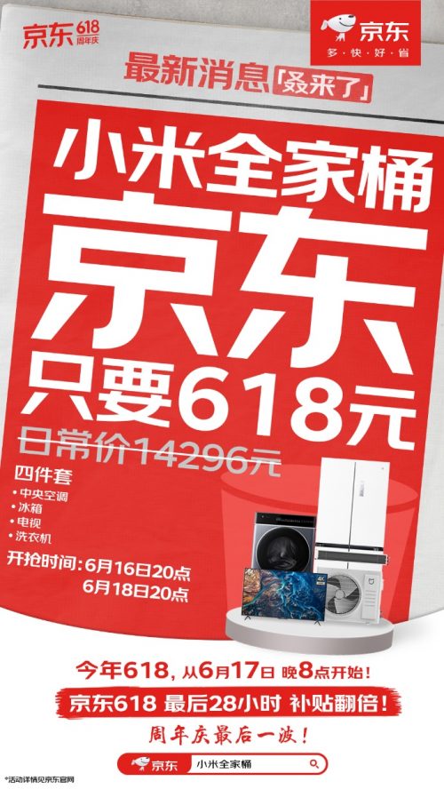 大家電是居家的必備,但同時也有著昂貴的價格。小米的中央空調、冰箱、洗衣機、電視這四大件搭配在一起,日常購買價格高達14296元,不過在京東618,小米四件套全家桶只要618元!6月16日20點和18日20點,小米全家桶震撼低價準點開搶,數量有限搶完即止!