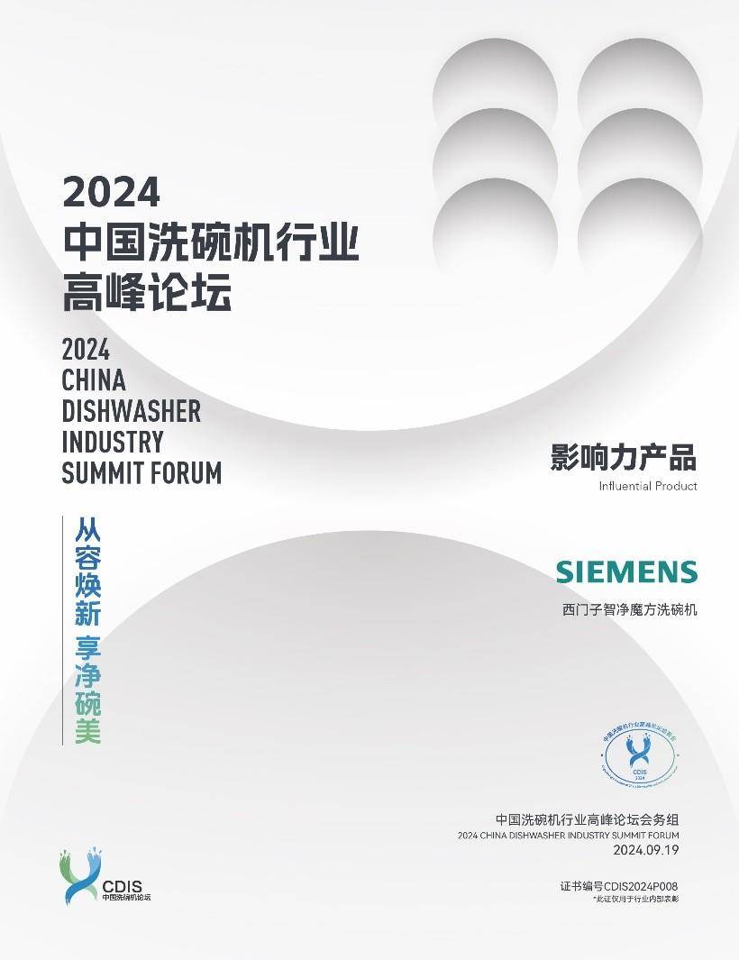 西門子智凈魔方洗碗機榮獲“2024中國洗碗機行業高峰論壇影響力產品獎”