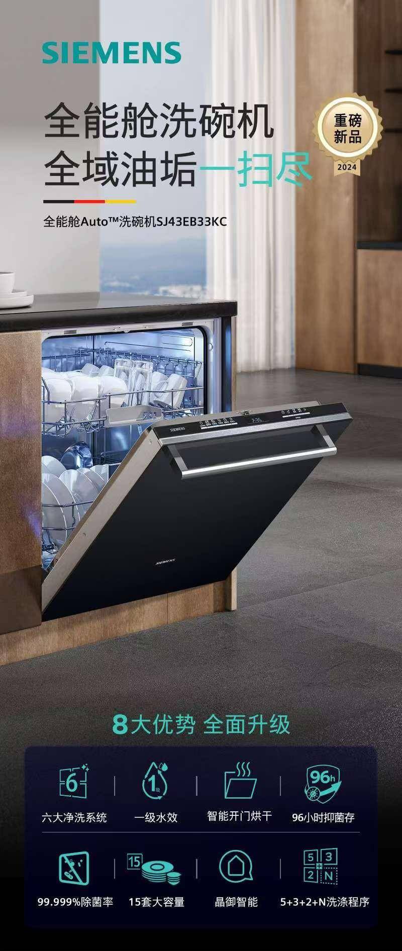這款旗艦新品在外觀、洗凈、消毒、烘干和抑菌存儲等多個領域進行了全面升級,重新定義了餐具潔凈體驗。西門子智凈魔方洗碗機創新性使用瀑布式外觀門板及西門子獨有的品牌之光,打造集未來感與科技感于一體的洗碗機,重塑高端廚房美學。全新微米蒸汽預洗技術,通過50℃以上的微米蒸汽預處理餐具,提前軟化頑固污漬。配合專利iTurbo智能洗,4倍水流精準沖刷,洗凈指數高達行業頂級1.29,較國家水效一級標準提升15%,輕松橫掃重油頑垢;榮獲權威機構的五星消殺證書,對大腸桿菌、金黃色葡萄球菌和幽門螺桿菌除菌率等9種病菌除菌率都達到99.99%,更加呵護消費者的健康。升級專利晶蕾烘干5.0技術將最高溫度提升至110°,烘干效率顯著提高,烘干指數提升至1.24,優于國家一級標準干燥指數13%。并且可以實現240小時超長干爽抑菌儲存 。