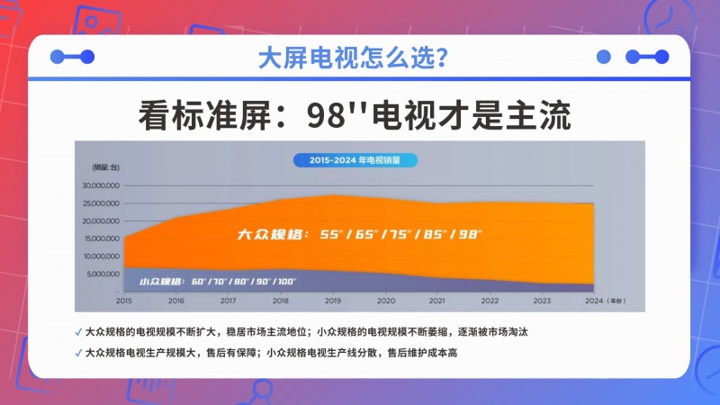 在電視市場中,55/65/75/85/98吋這些大眾規(guī)格電視如同常青樹,市場占有率逐年攀升,背后是成熟的產(chǎn)線、穩(wěn)定的工藝以及全面的售后服務(wù)體系。相比之下,60/70/80/90/100吋這些小眾規(guī)格,由于市場規(guī)模有限,產(chǎn)線分散,產(chǎn)能不足,工藝不穩(wěn)定,導(dǎo)致產(chǎn)品質(zhì)量堪憂,維修成本也高,正逐漸淡出市場。簡而言之,98吋電視不僅是大眾之選,更是穩(wěn)健之選。