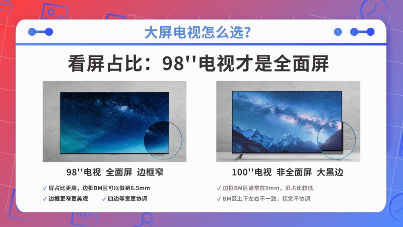 另外說到大屏電視,全面屏也是繞不開的話題。98吋電視以其高屏占比、窄邊框設(shè)計(jì),將視覺體驗(yàn)感拉滿,邊框BM區(qū)僅為6.5mm。而100吋電視技術(shù)不夠成熟普遍BM區(qū)只能做到9mm,大黑邊顯得不夠精致。更重要的是,98吋電視采用先進(jìn)工藝,上下左右BM區(qū)等寬,全面屏設(shè)計(jì)既美觀又協(xié)調(diào),反觀100吋電視,不等寬的邊框設(shè)計(jì)讓人視覺體驗(yàn)大打折扣。