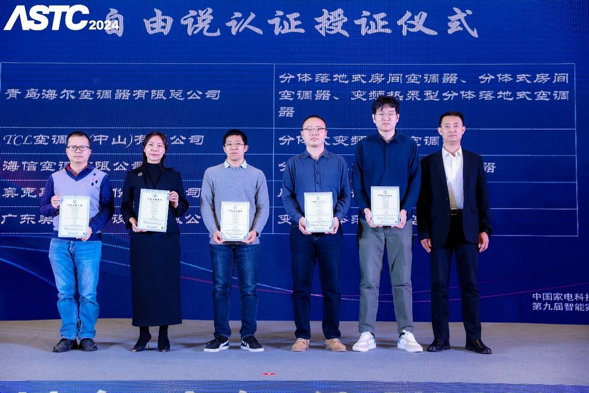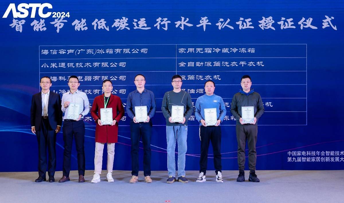 本次大會上還發(fā)布了最新的智能產(chǎn)品認證。包括自由說認證、AI節(jié)能認證、智能節(jié)能低碳運行水平認證、智能恒溫認證、智能認證、特色認證等自愿性認證,青島海爾空調(diào)器有限總公司、TCL空調(diào)器(中山)有限公司、海信空調(diào)有限公司、奧克斯空調(diào)股份有限公司、廣東美的制冷設(shè)備有限公司、海信冰箱有限公司、海信容聲(廣東)冰箱有限公司、長虹美菱股份有限公司、東芝家用電器制造(南海)有限公司、合肥美的電冰箱有限公司、上海科慕電器有限公司、珠海格力電器股份有限公司、小米通訊技術(shù)有限公司、佛山凈微科技有限公司、青島海爾洗衣機有限公司、寧波方太廚具有限公司、廣東美的廚衛(wèi)電器制造有限公司、青島經(jīng)濟技術(shù)開發(fā)區(qū)海爾熱水器有限公司、廣東萬家樂燃氣具有限公司、中山百得廚衛(wèi)有限公司、廣東萬和新電氣股份有限公司、青島海信日立空調(diào)系統(tǒng)有限公司、小米智能家電(武漢)有限公司、廣東美的暖通設(shè)備有限公司、青島江森自控空調(diào)有限公司、TCL家用電器(合肥)有限公司、三菱重工海爾(青島)空調(diào)機有限公司、九陽股份有限公司等(以上排位不分先后)近30家智能家電、智能家居制造企業(yè)的多款產(chǎn)品獲得了認證證書。