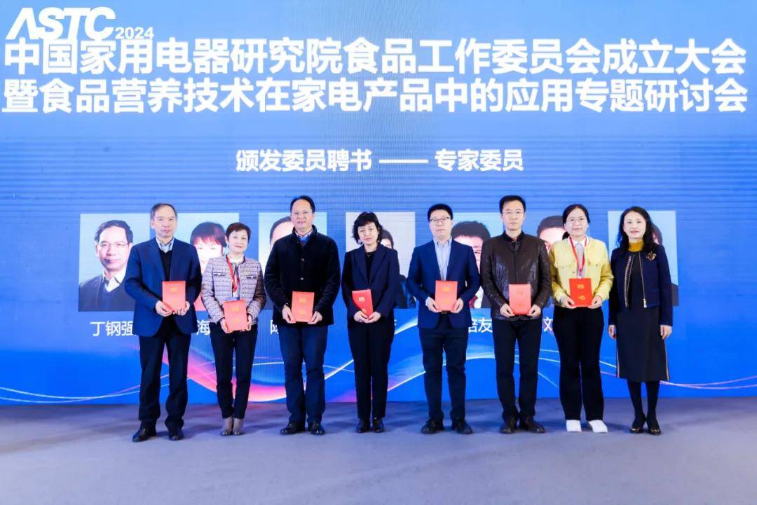 中國家用電器研究院食品工作委員會主任宮赤霄向中國疾病預防控制中心營養與健康所所長、主任醫師丁鋼強,浙江省農業科學院食品科學研究所省特級專家、研究員郜海燕,浙江省農業科學院食品科學研究所所長、研究員陳杭君,江南大學食品學院教授鐘芳,北京市農林科學院農產品加工與食品營養研究所研究員秦培友,北京工商大學食品風味與健康交叉創新研究院常務副院長、教授劉野,浙江省農業科學院食品科學研究所主任、副研究員劉瑞玲頒發專家委員聘書。