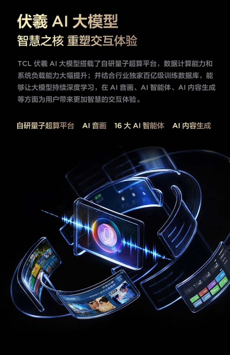 此外,AI作為當下的大熱賽道,TCL作為技術領域的先行者自然也不可能缺席的。全新推出的伏羲AI大模型用一句話來說就是“相當聰明”!它使得電視可以像人一樣思考,而這主要得益于搭載的TCL自研量子超算平臺,算力和系統(tǒng)負載能力都非常驚人,可以支持AI音畫、AI智能體以及AI內容生成等,讓電視的交互體驗大幅提升,你想要的都能迅速響應滿足你的需求。