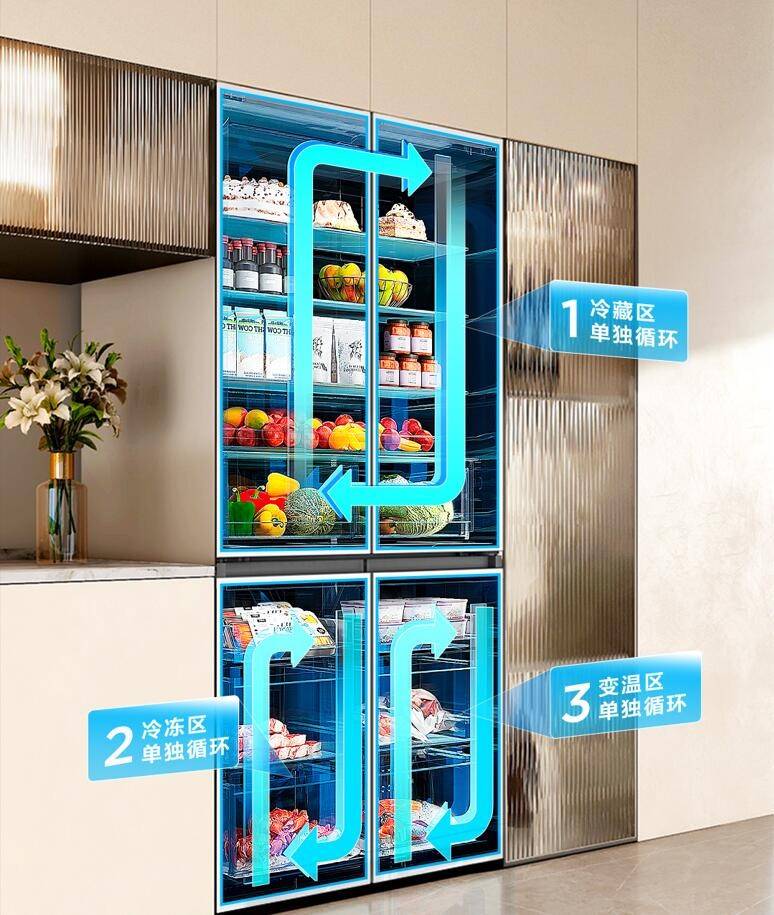 與普通冰箱只有一個蒸發器制冷且冷藏室和冷凍室風道聯通不同,T9 Pro冰箱配備了兩個蒸發器制冷,冷藏室和冷凍室空間完全隔絕,實現了冷氣專用,不僅避免了冷藏食材和冷凍食材之間串味,更讓冰箱整體溫控更穩定,提高制冷效果,減緩食物本身分解產生的異味。同時,它是三循環設計,即冷藏室、冷凍室和變溫艙都有獨立的循環風道,空氣循環互不干擾,避免了冰箱內氣味混雜,也防止細菌在箱內亂竄,減少異味流竄。
