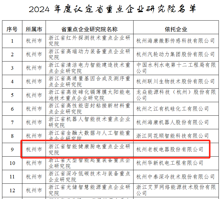 日前,浙江省經濟和信息化廳正式公布《關于公布 2024 年度認定(備案)省級企業研發機構名單的通知》,老板電器旗下的 “浙江省智能健康廚電重點企業研究院” 赫然在列,成功入選 2024 年浙江省重點企業研究院。這不僅是對老板電器過往輝煌創新歷程的高度肯定,更是其在廚電領域持續深耕、引領行業未來發展的有力見證。此前,老板電器已攬獲國家企業技術中心、國家工業設計中心、國家知識產權示范企業等諸多國家級平臺認證,此次入選省級重點企業研究院,無疑是其創新征程上的又一座熠熠生輝的里程碑。