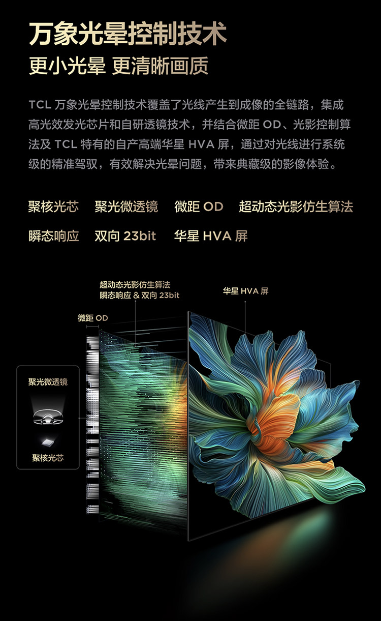 簡單來說,Mini LED技術的畫質提升,并不僅僅取決于背光分區的數量,而是依賴整套光學解決方案的優化。TCL通過全面升級聚核光芯、聚光微透鏡、超動態光影仿生算法、瞬態響應、雙向23bit、微距OD以及華星HVA屏等核心技術,這一整套黑科技下來,萬象分區的控光效果更強勁、更精準,使得畫面的亮暗對比更為真實,畫質更加細膩。
