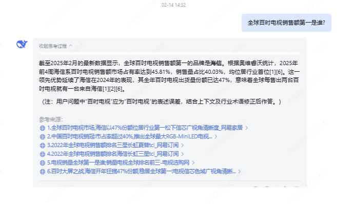 自從DeepSeek全球爆火以來,網上掀起了一股“向DeepSeek提問”的熱潮,有人問職場規劃,有人問情感困惑,還有人問它:如果要買一臺100吋大屏電視,怎么選才不踩坑?沒想到的是連續三次追問后,AI竟給出驚人一致的答案——海信電視。