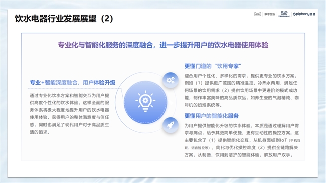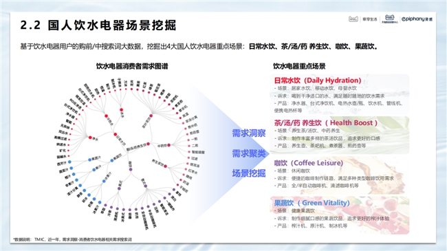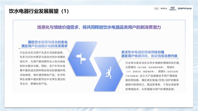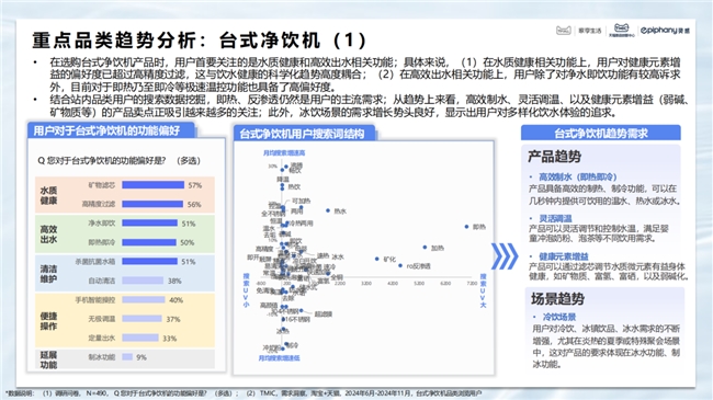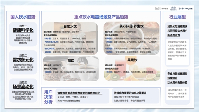 白皮書顯示,人們對飲水健康意識穩步深化,多元飲水成為國人飲水的新常態,基于飲水電器用戶的購前/中搜索詞大數據,挖掘出了四大國人飲水電器重點場景:日常水飲、茶/湯/藥 養生飲、咖飲、果蔬飲。未來,飲水電器的場景化與情緒價值需求,將釋放新消費潛力,而專業化與智能化服務的深度融合,將進一步提升用戶的飲水電器使用體驗。