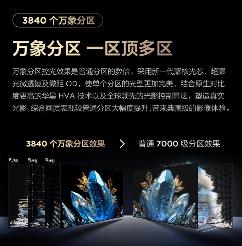 突破美學極限的同時,TCL C12K還對Mini LED顯示技術核心領域展開升級。首先面板選擇上,其采用華星HVA屏的最高配版蝶翼華曜屏。與傳統IPS硬屏相比,該屏幕實現了5倍對比度的提升,對比度高達7000:1,還擁有行業最低反射率,以及超廣色域、超廣色視角等特性,且開創性地消除了普通屏幕的黑邊感,為用戶打造極致的視覺體驗。