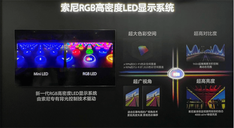 索尼 RGB高密度LED顯示系統的成功開發,可突破現有背光顯示的技術限制,實現更加豐富細膩的色彩質感。該系統通過可獨立驅動的RGB三原色背光燈與高密度 LED 光源的深度整合,實現了對紅(R)、綠(G)、藍(B)三原色的精準獨立控制,為大尺寸顯示設備帶來更寬廣的色域、更高的峰值亮度以及精準的色彩表現。