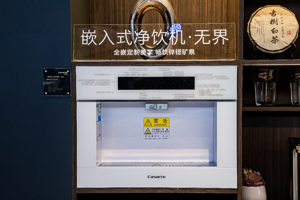 除了卡薩帝的「黃金礦泉」凈水機,另一款嵌入式凈飲機·無界也來到了現場。通過將全嵌定制與鋅鍶礦泉相結合,凈水機既能提供健康礦泉水,又能滿足用戶對全嵌入式無縫美學的審美需求,打造獨屬于自己的高端差異化優勢。