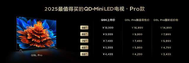 新品系列中尺寸最大、配置最高的Q9L Pro 98吋機型疊加國補后售價不超過15000元,價格最低的55吋 T7L國補后只有2799元,以這樣的預算,就能買到屏幕和控光技術行業領先的主流產品,足以顛覆消費者對電視技術和產品品質的認知,質價比之王實至名歸。