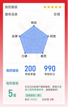 TCL空調星服務標準體系指的是五星級工程師認證體系,是行業首個服務能力量化評估模型,采用五維動態評估機制,全面覆蓋了服務響應、服務時效、服務規范、用戶口碑以及工作紀律五大方面。