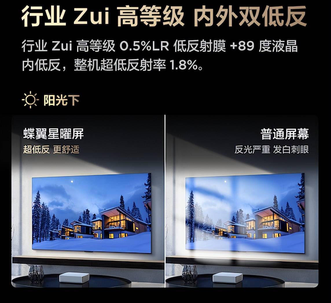 說到底,電視反光的核心癥結,就在于屏幕技術。普通電視的“鏡面屏”,如其名就像一面鏡子,會把所有光線都反射回來。雖然市面上有非常多抗反光產品,但是很多品牌由于技術限制、或者成本管控等原因,采用的是AGLR低反(低反+磨砂結合)方案。這種方案將反射率降低至2.6%,但是磨砂質感帶來的對比度折損仍讓畫質表現留有遺憾,所以算是一種妥協的方案。