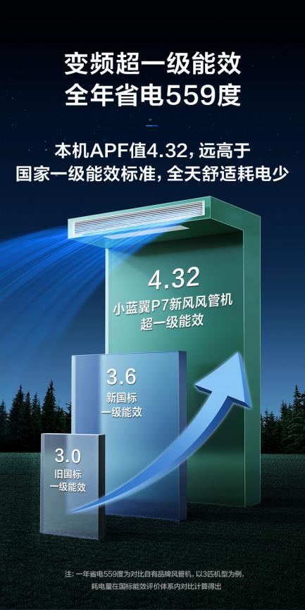 針對用戶關注的能耗問題,小藍翼 P7 新風風管機以AI 省電功能給出最優(yōu)解。其 AI 大數據模型算法 2.0 可智能學習用戶使用習慣,動態(tài)調節(jié)運行參數,制冷制熱均能實現至高省電 40%;配合變頻超一級能效(APF 值 4.32,遠超國家一級能效標準 3.6),按全年使用周期計算,相比普通空調可省電 559 度,在踐行綠色節(jié)能理念的同時,也為用戶省下可觀電費。