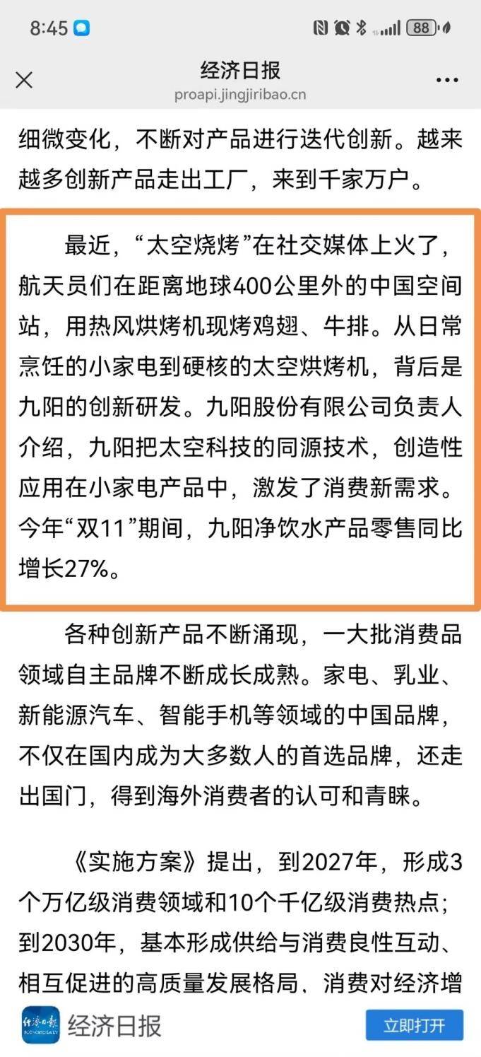 報道對國民品牌九陽研制熱風烘烤機,并將太空科技創(chuàng)新民用化,激發(fā)消費新需求,助力人們美好生活的舉措給予贊揚。