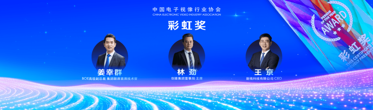 2025年度“彩虹獎”的三位獲得者分別是京東方科技集團股份有限公司高級副總裁、聯席首席技術官 姜幸群,創維集團有限公司董事局主席 林勁,新線科技有限公司CEO王京。三者的獲獎理由分別是:推動AI賦能顯示工業。構建全球領先的AI畫質增強體系和全鏈路AI質檢體系,實現裸眼3D、自然交互與AIGC內容生成在終端落地;打造基于智能技術系統、OTT互聯網等平臺基礎,廣泛覆蓋智慧屏、智能家居等智能終端的軟硬一體化科技生態;致力于智能交互、軟件生態及前沿材料科學等關鍵領域,并轉化為具備高度商業價值的會議與教育場景音視頻產品解決方案。