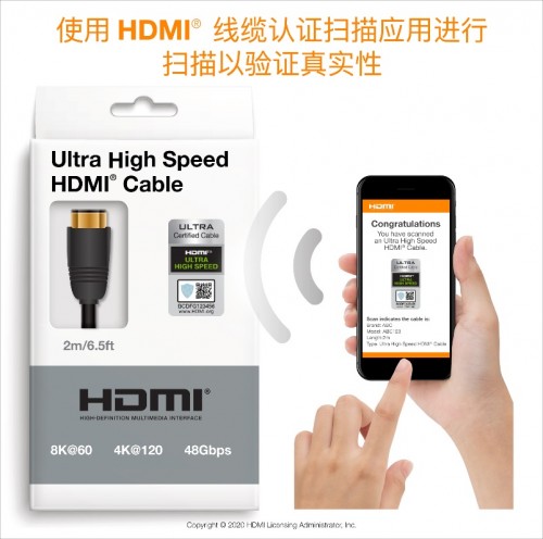 所有線纜都必須在每個包裝或銷售單元上展示超高速 HDMI? 認證標簽。標簽能使消費者通過使用 HDMI 線纜認證應用進行掃描來驗證和認證每種型號。