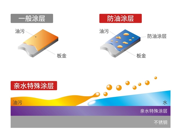 除此之外,富士帝CXW-230-CL2系列油煙機最為關(guān)鍵的油煙分離盤的表面還使用了一種“親水特殊涂層”。有了這種涂層,使油污遇到水后,更加容易浮起,便于清潔。
