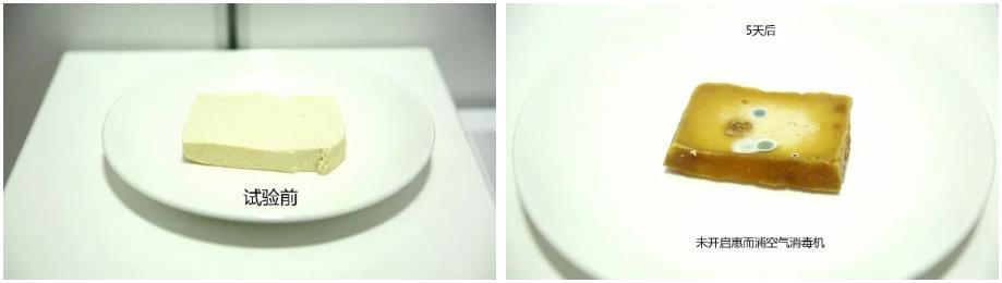從圖中可以看出,經過5天的試驗對比,沒有消毒機保護的豆腐已經發霉變質;而通過消毒機保護的豆腐除了四周較干外,并沒有生長任何的霉菌。可見,惠而浦空氣消毒機夠對室內空氣進行凈化,效果顯著。