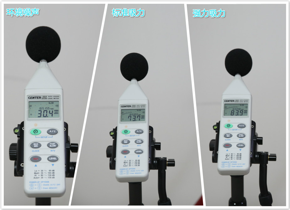 通過測試可以看出在標準吸力模式下,噪聲73.7dB(A)還能承受。