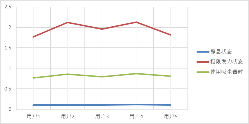 如下圖,由上到下的線條分別代表5名用戶在進行地面清潔時的主力手的肱二頭肌的極限發力狀態時的肌肉電信號值、使用這臺吸塵器時的肌肉電信號平均變化值與靜息狀態下的肌肉電信號值,不難看出,使用這臺吸塵器時,主力手的肌電激活程度處于我們肌肉發力能力的較低水平,5名用戶在進行地面清潔時主力手的肱二頭肌平均耗力程度為38.53%,用戶使用時會感覺較省力。